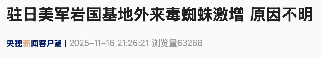 近期,位于日本山口县的驻日美军岩国基地外来毒蜘蛛数量激增,目前尚不清楚原因。山口县和岩国市政府要求美军彻底清除毒蜘蛛,以免危害民众健康。