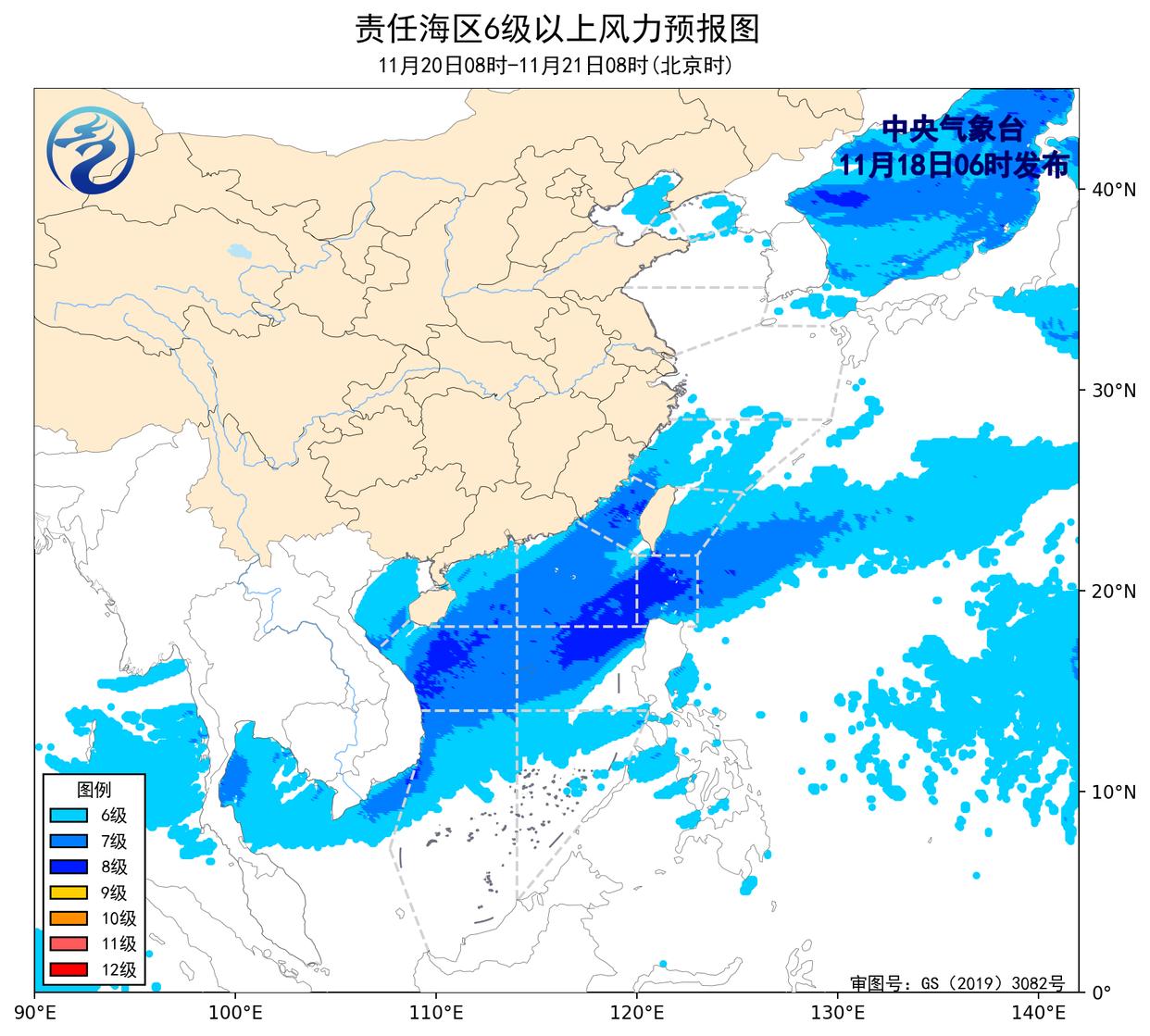 20日08时至21日08时,巴士海峡、南海东北部和中东部海域将有6~8级、阵风9级的东北风,台湾海峡、台湾以东洋面、南海西部海域将有5~7级、阵风8级的东北风,东海南部海域、北部湾、琼州海峡、南海东南部海域将有5~6级、阵风7级的偏北到东北风。