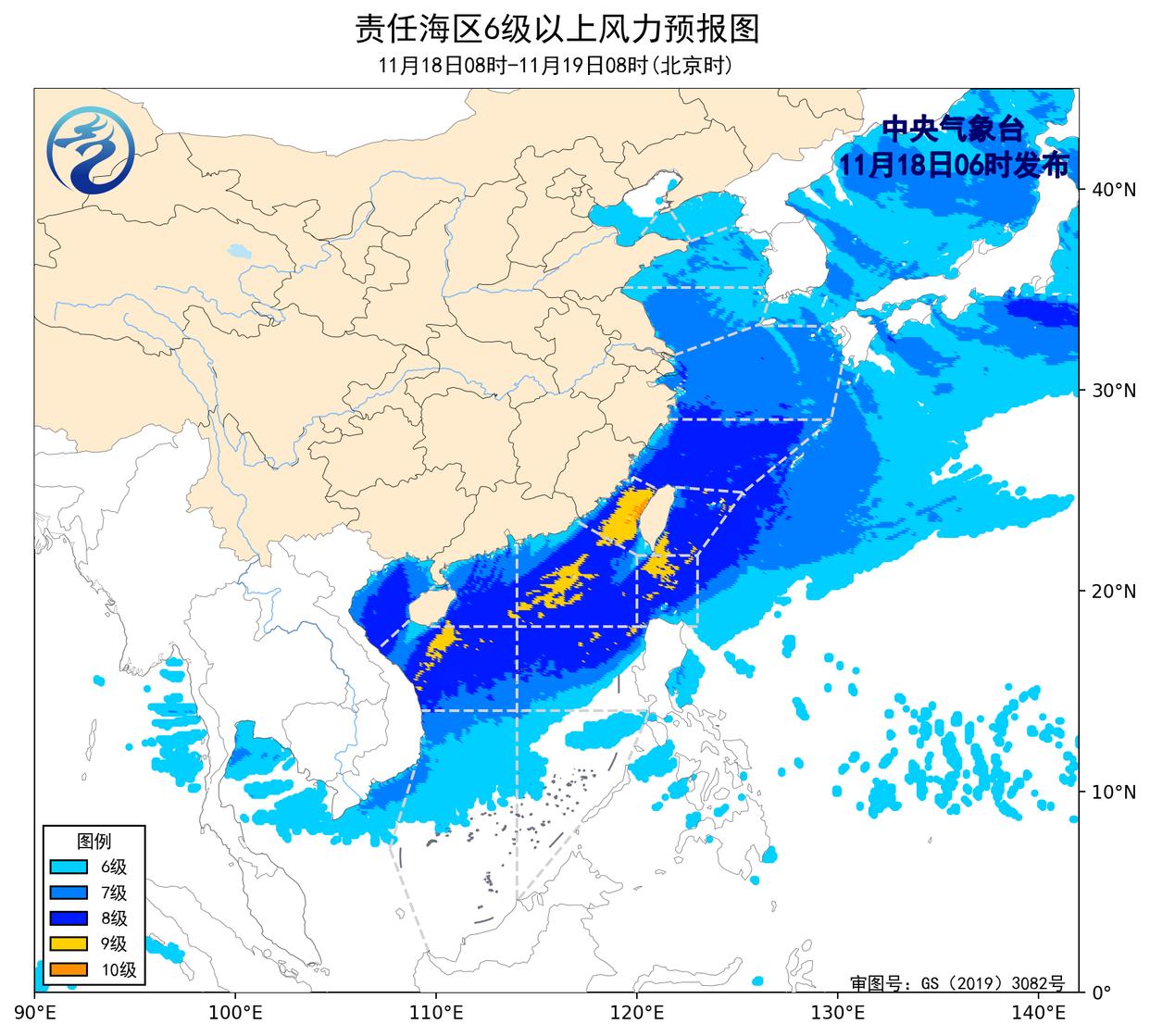 18日08时至19日08时,台湾海峡将有8~9级、阵风10级的偏北到东北风,东海南部海域、台湾以东洋面、巴士海峡、北部湾、南海北部和中部海域将有6~8级、阵风9级的偏北到东北风,东海北部海域、琼州海峡将有6~7级、阵风8级的偏北到东北风,渤海海峡、黄海大部海域将有4~6级、阵风7级的偏北到西北风,南海南部海域将有4~6级、阵风7级的东北风,渤海将有4~6级、阵风7级的西北风到偏西风。