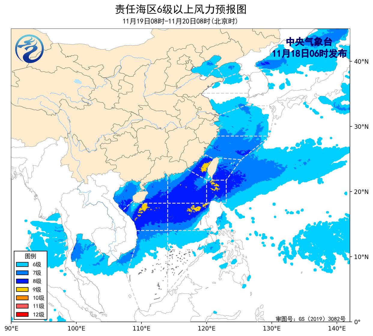 19日08时至20日08时,台湾海峡将有7~9级、阵风10级的东北风,台湾以东洋面、巴士海峡、北部湾、南海北部和中部海域将有6~8级、阵风9级的偏北到东北风,东海南部海域、南海西南部海域将有5~7级、阵风8级的东北风,渤海、渤海海峡、黄海北部海域将有4~6级、阵风7级的偏西到西南风,东海北部海域、琼州海峡、南海东南部海域将有4~6级、阵风7级的偏北到东北风。
