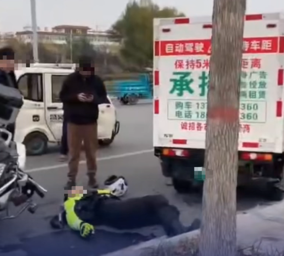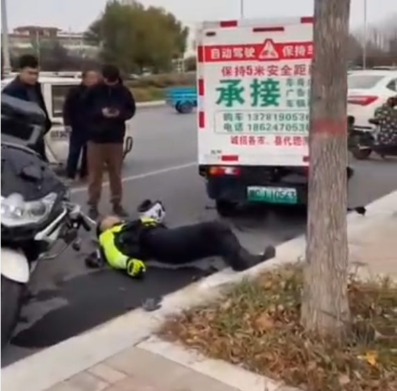 11月17日,河南新乡。有市民发布视频称,一交警瘫倒在地,面前停着快递无人车。