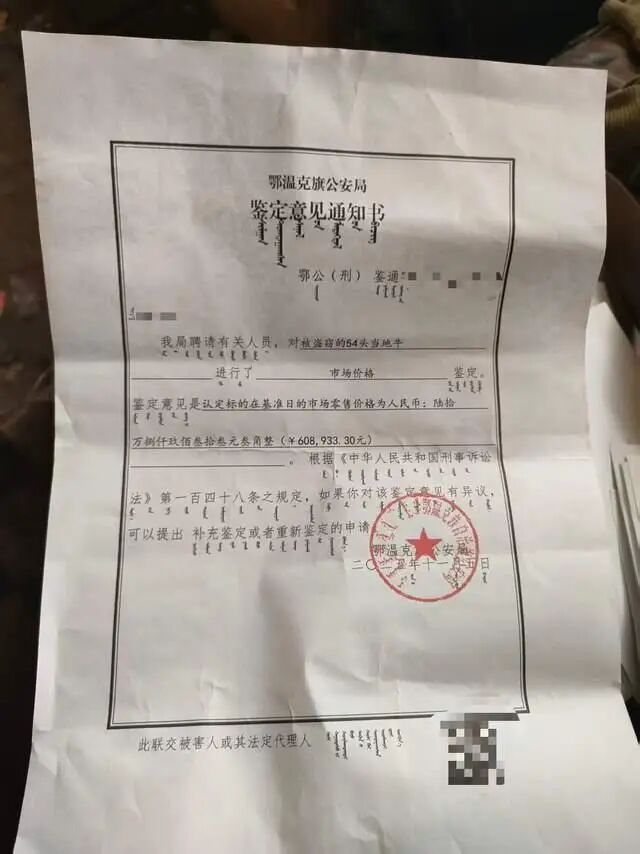 11月18日,记者联系鄂温克旗公安局经侦大队了解情况,据办案民警介绍,田先生一家608933.3元的损失,是其聘请鄂温克旗发改委价格鉴定办公室的专业人员依据市场价做出的鉴定,目前案件仍在进一步侦办中。民警同时表示:“牧民一辈子积蓄不易,我们深感理解,后续会依法推进。”