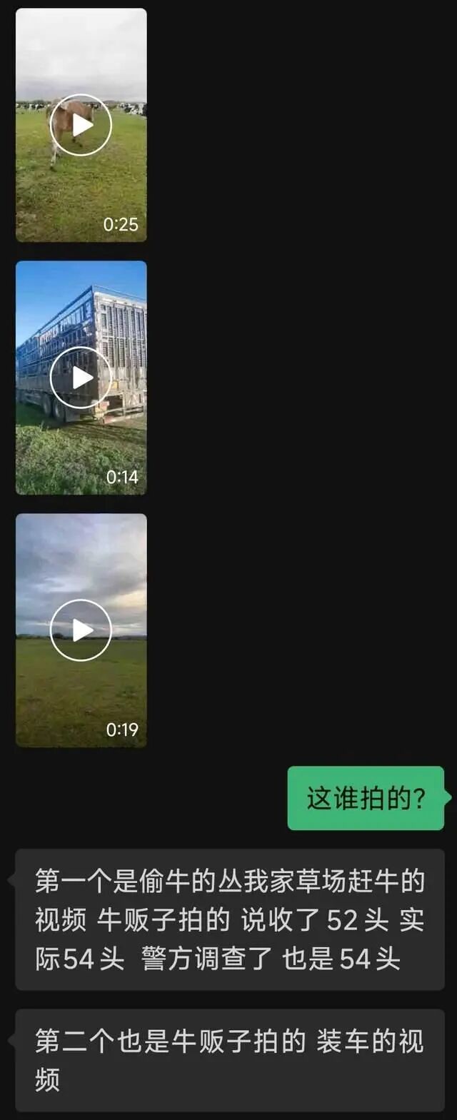 偷牛者拍摄的第一视角视频显示,画面中的草原上有50余头牛,其中大部分都是黑白相间的奶牛,男子将牛赶到指定地点后,用卡车将牛运走,期间偷牛者多次吆喝称“高价收牛”。