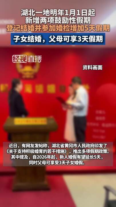 11月18日,记者从此前黄冈市人民政府发布的《关于支持积极婚育的若干措施》通知中获悉,自2025年6月25日起登记结婚的青年,可享受15天婚假,该假期不含法定节假日。自2026年1月1日起,黄冈市将新增两项鼓励性假期:一是鼓励用人单位为登记结婚并参加婚检的职工增加5天假期;二是鼓励用人单位给予子女结婚的职工3天假期,子女生育时给予5天假期。