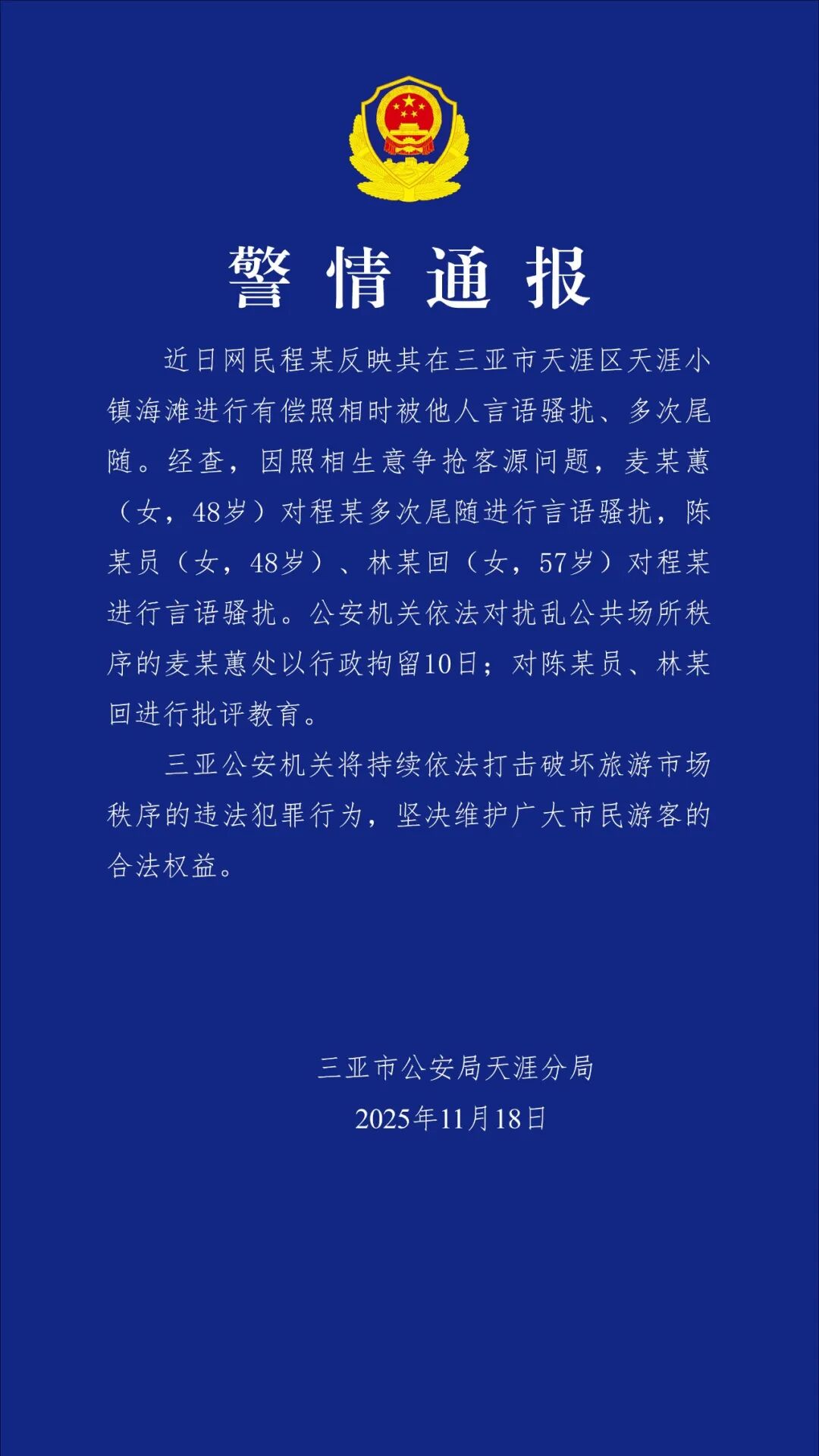 近日网民程某反映其在三亚市天涯区天涯小镇海滩进行有偿照相时被他人言语骚扰、多次尾随。经查,因照相生意争抢客源问题,麦某蕙(女,48岁)对程某多次尾随进行言语骚扰,陈某员(女,48岁)、林某回(女,57岁)对程某进行言语骚扰。公安机关依法对扰乱公共场所秩序的麦某蕙处以行政拘留10日;对陈某员、林某回进行批评教育。三亚公安机关将持续依法打击破坏旅游市场秩序的违法犯罪行为,坚决维护广大市民游客的合法权益。