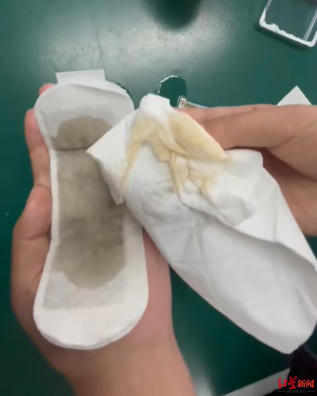 11月19日,红星新闻记者通过外卖平台购入雪莲清护垫,价格为25.8元,一盒内有两片护垫,每片均采用铝膜独立封装。拆开包装后,能闻到一股明显的中草药气味,其外观与普通卫生护垫无明显差异。记者将一杯饮用水倒在护垫表层,水很快渗透至内部中药层,随后护垫表面出现显色现象。用纸巾擦拭显色部位后,纸巾上也残留了相应的颜色。