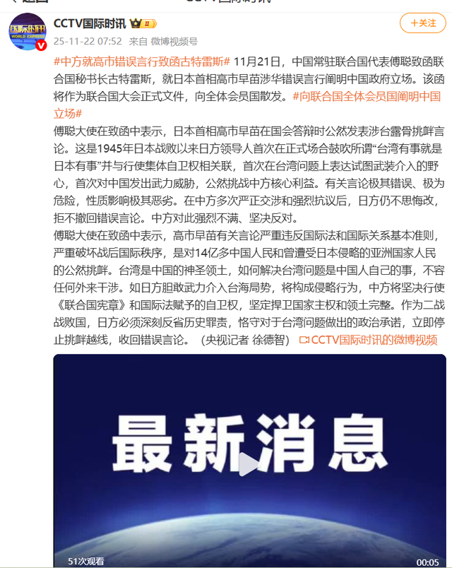 11月21日,中国常驻联合国代表傅聪致函联合国秘书长古特雷斯,就日本首相高市早苗涉华错误言行阐明中国政府立场。该函将作为联合国大会正式文件,向全体会员国散发。