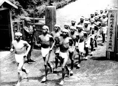 1944年,“新竹州高砂族青年修练所”的原住民青年在接受军事训练。这些人后来成了日本帝国主义的炮灰,许多人惨死异域。