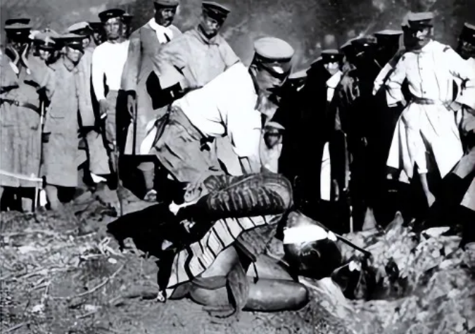 1913年,日军台湾守备队血腥镇压台湾民众,对抗日勇士公开斩首。日军曾将这幅照片刊登在随后发行的所谓“征讨”问册上,以此为炫耀。