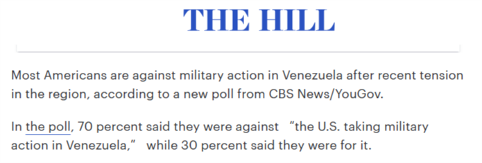 美国《国会山报》的报道称,由哥伦比亚广播公司与民调机构舆观调查公司进行的民调显示,70%的美国人反对“美国在委内瑞拉采取军事行动”。