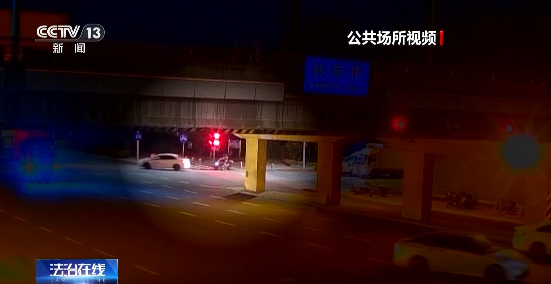 吴扬:他是23时54分到达,23时58分离开,这期间信号灯也是多轮变换。等待信号灯的时候,冯某又出现了第五次原地倒车的行为,之后在冯某将车扶起后,驾车通过了林萃桥下路口 。