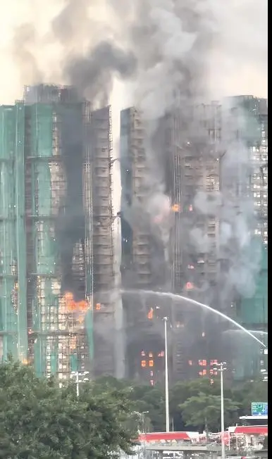 “防护网燃烧快+8栋楼同时施工成隐患”