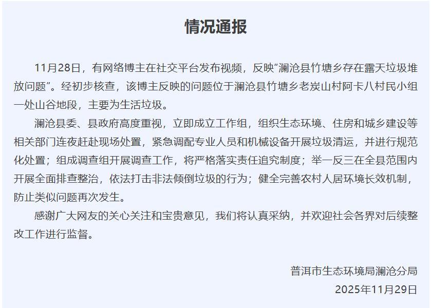 11月29日,普洱市生态环境局澜沧分局发布情况通报:有网络博主28日在社交平台发布视频,反映“澜沧县竹塘乡存在露天垃圾堆放问题”。经初步核查,该博主反映的问题位于澜沧县竹塘乡老炭山村阿卡八村民小组一处山谷地段,主要为生活垃圾。