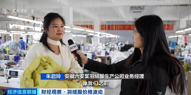 安徽六安某羽绒服生产公司业务经理 朱启玲:这件羽绒服之前零售的价格是599元,最近因为羽绒价格上涨,所以销售的价格约为600多元,比之前上涨了80元至100元。