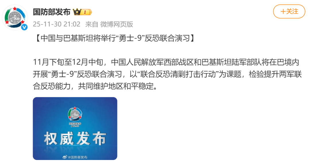 据国防部发布:11月下旬至12月中旬,中国人民解放军西部战区和巴基斯坦陆军部队将在巴境内开展“勇士-9”反恐联合演习,以“联合反恐清剿打击行动”为课题,检验提升两军联合反恐能力,共同维护地区和平稳定。