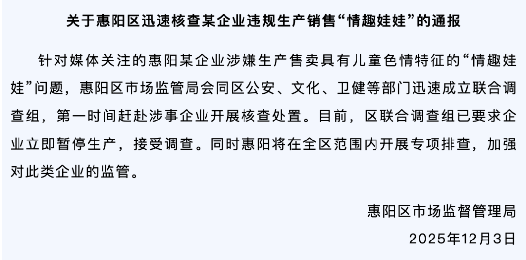 通报称,针对媒体关注的惠阳某企业涉嫌生产售卖具有儿童色情特征的“情趣娃娃”问题,惠阳区市场监管局会同区公安、文化、卫健等部门迅速成立联合调查组,第一时间赶赴涉事企业开展核查处置。