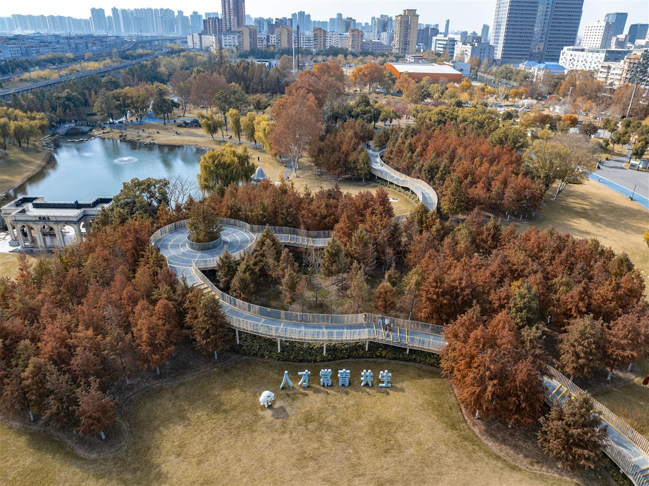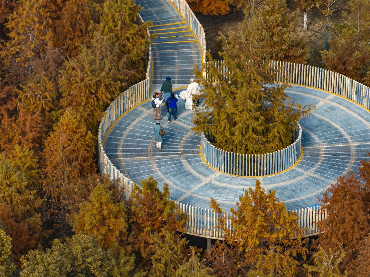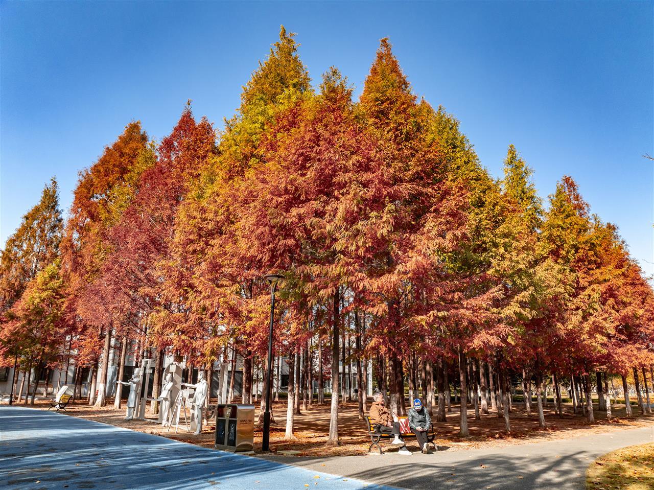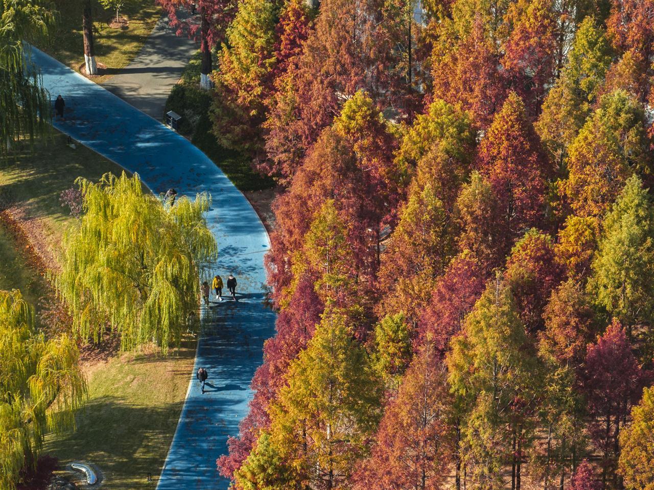 据了解,常青公园拥有多种色叶树木。其中,金陵红枫151棵,为2021年底公园改造后重新开放时引进的特色树种,也是江汉区属公园中独有的品种;另有水杉355棵,并搭配鸡爪槭、乌桕等色叶植物,形成丰富的季相景观。这些色叶树种的观赏期主要集中在11月底至12月,如乌桕、榉树等大约在10月下旬至11月中下旬,金陵红枫观叶期在11月底至12月中旬左右,水杉观叶期则持续整个12月份。其间树叶由绿色逐渐转变为红色,或橙红或深红,色彩变化层次分明,吸引了众多游客和摄影师前来欣赏和记录,成为初冬最美的风景之一。