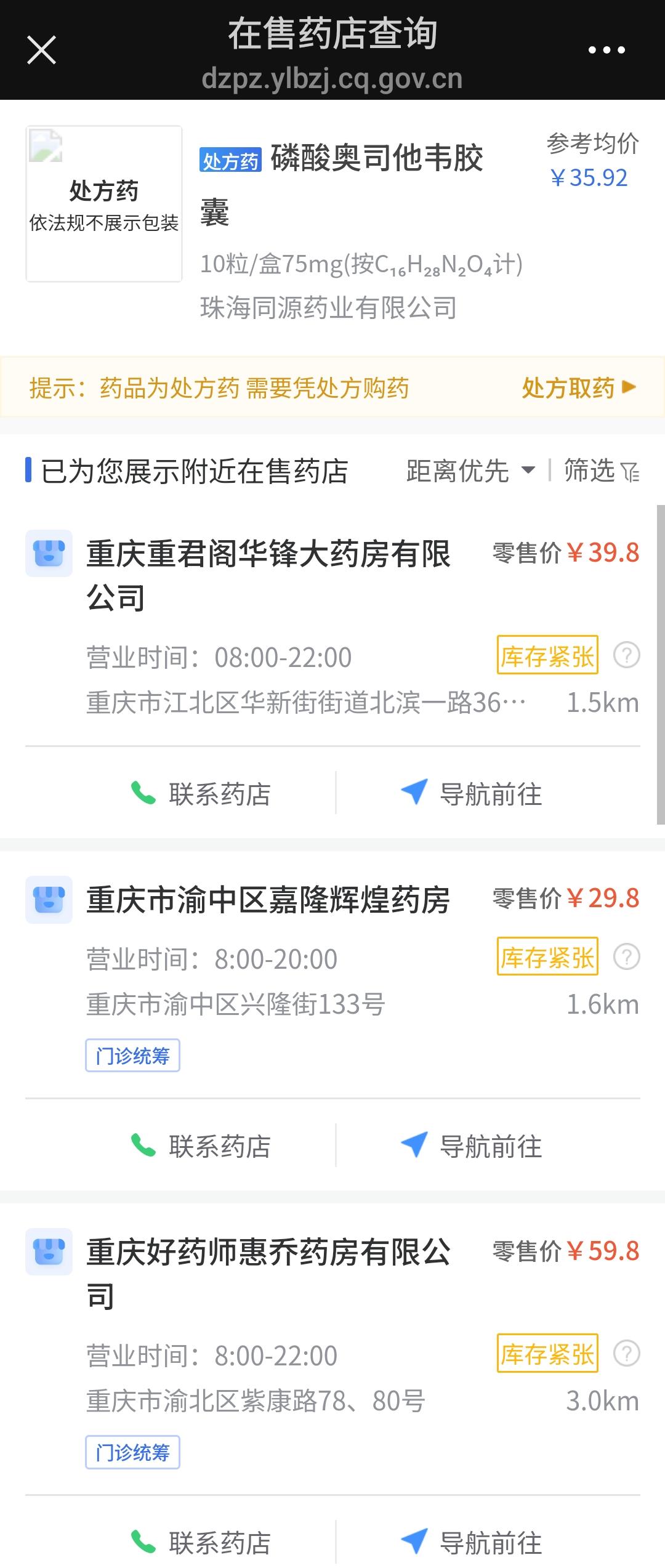 4日,红星新闻在重庆市医保局推出的医保定点药店比价平台“药价智慧比”上查询到,珠海同源药业的磷酸奥司他韦胶囊10粒装,共82家在售,参考均价为35.92元,最低14元,最高68元。该平台目前未上线医院比价功能。同时,查询外卖平台(“即时达”),该药在重庆线下药店价格最低为18元。