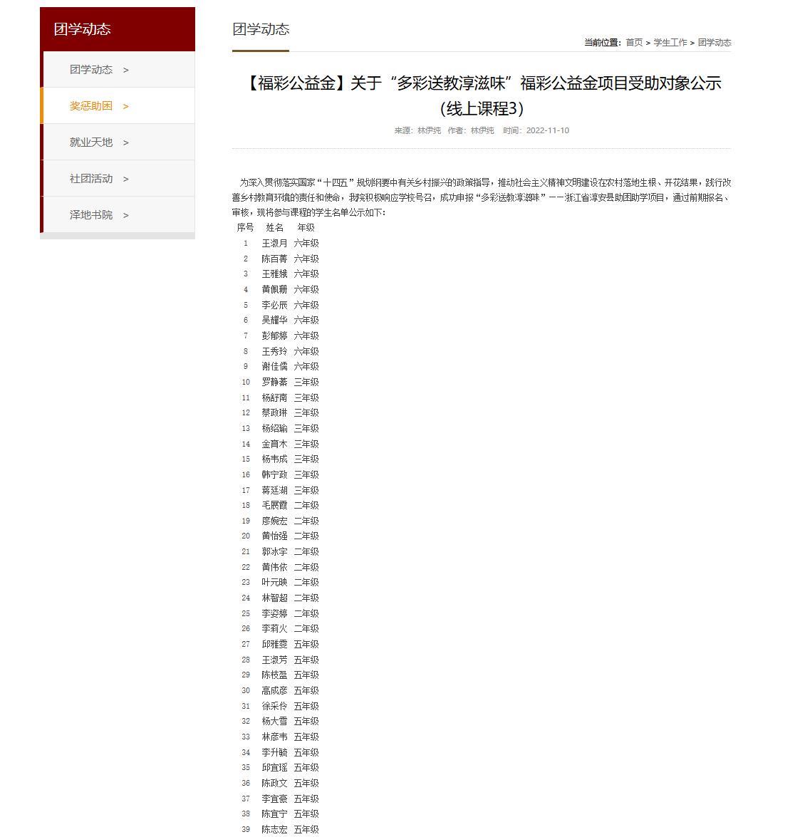 12月5日,极目新闻记者登录杭州师范大学人文官网看到一份《【福彩公益金】关于“多彩送教淳滋味”福彩公益金项目受助对象公示(线上课程3)》的公示名单,其所使用的姓名确与《百度文库10,000个人名大全》中的部分姓名顺序和人名一致。当晚,该网页显示“无法查找”。