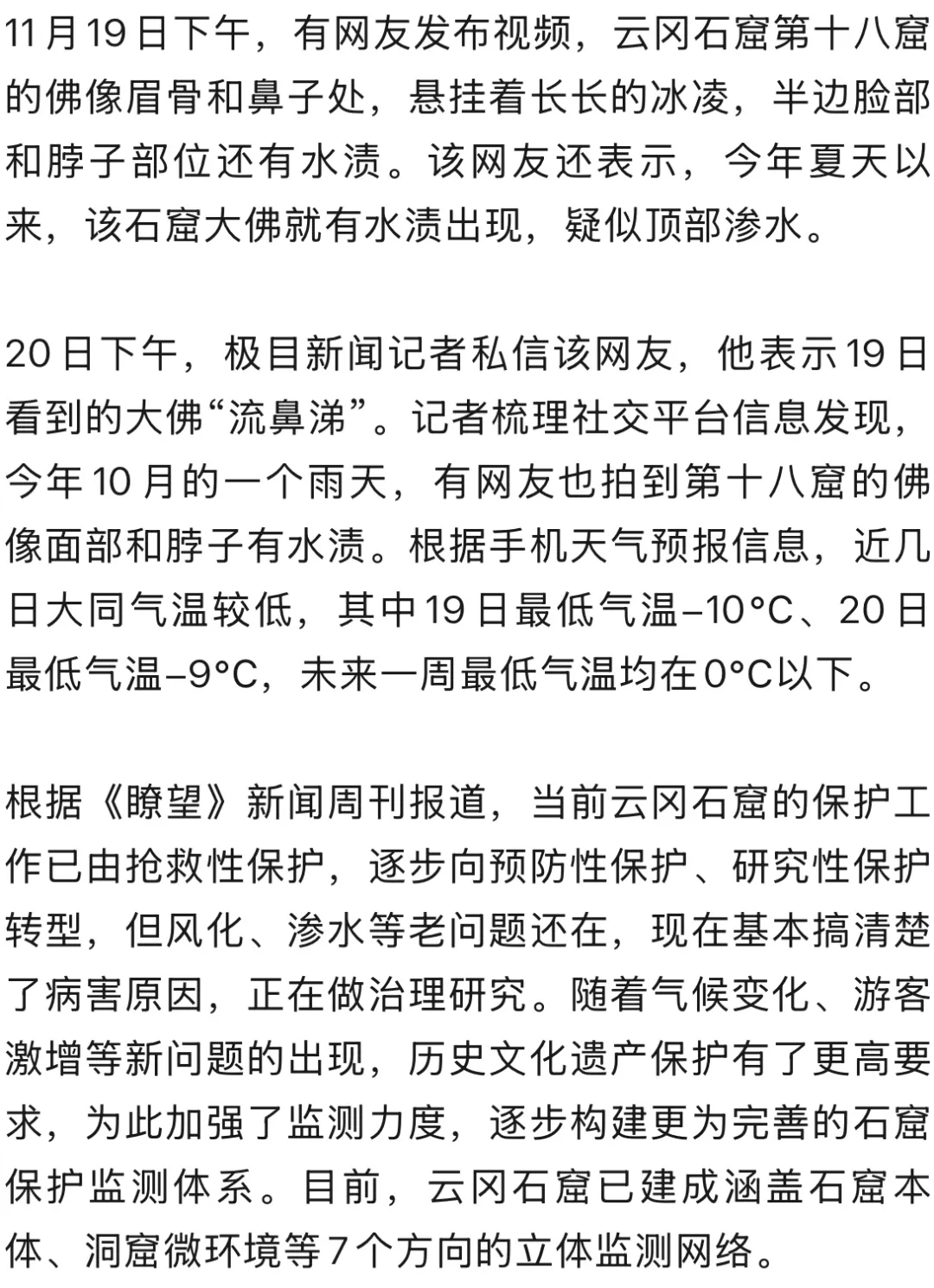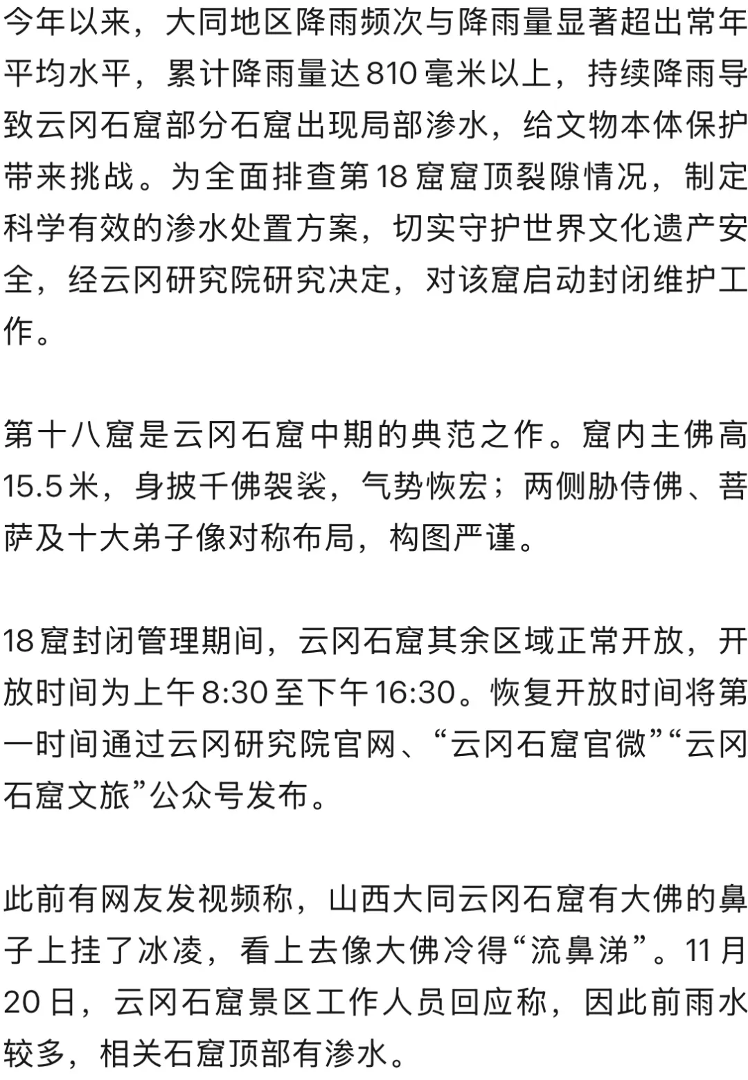 山西大同云冈石窟大佛被冻到“流鼻涕”?官方回应:12月8日起将对第18窟封闭管理,处置渗水