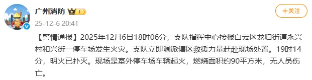 据@广州消防,2025年12月6日18时06分,支队指挥中心接报白云区龙归街道永兴村和兴街一停车场发生火灾。支队立即调派辖区救援力量赶赴现场处置。19时14分,明火已扑灭。现场是室外停车场车辆起火,燃烧面积约90平方米,无人员伤亡。