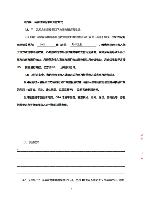 按照运营合同约定,戴先生每月可以享受6000元的收益,超出的收益他甚至可以拿到80%。戴先生称,签署的合同时间是今年2月份,但房子今年6月份才开始装修,“目前都没有装修完。”