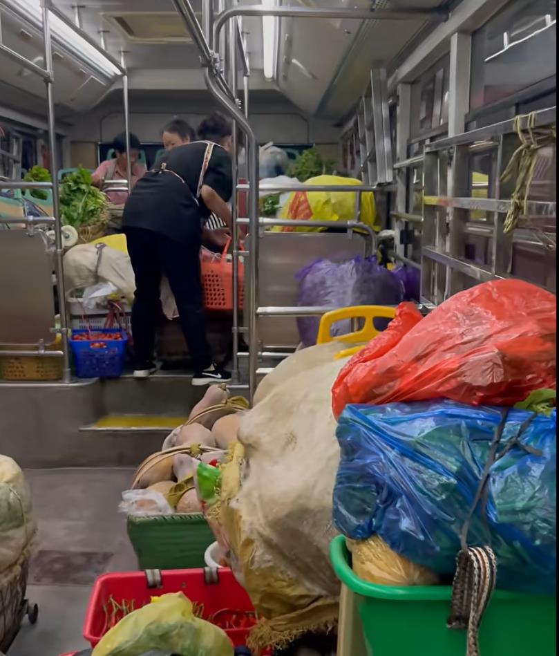 视频中,清晨5时,一大群村民在贵阳252路公交车宋家坝站等着上车,他们背着背篓、挑着扁担上车,背篓和扁担篓里装得满满的是蔬菜水果。公交车来了后,司机和村民们一起,将背篓和扁担篓放在了座椅上方的货架上,货架上被蔬菜和水果装得满满当当。