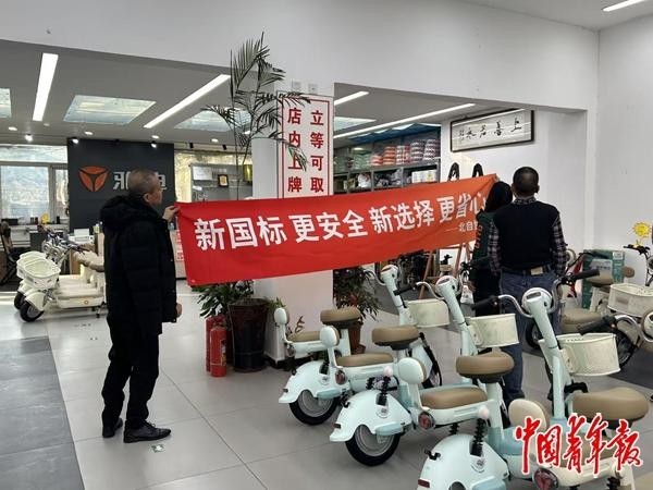 “从不允许销售老国标车开始,我们就把横幅和海报都挂上了,主要为了让消费者买新国标车时不糊涂。”北京市通州区一家爱玛电动车门店负责人对中青报·中青网记者说。这里的新国标,就是新版强制性国家标准《电动自行车安全技术规范》。与老版标准相比,新国标在安全方面要求更加严格。
