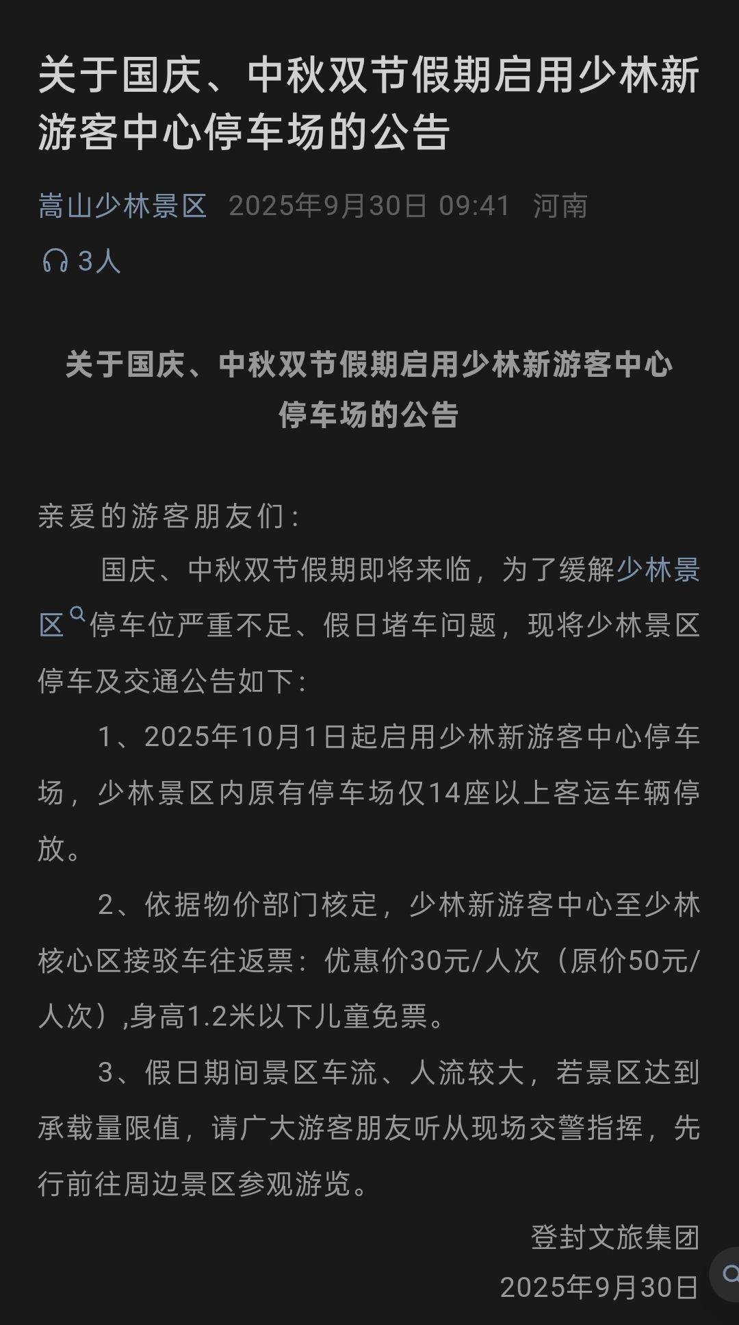嵩山少林景区此前发布的国庆、中秋节启用少林新游客中心停车场的公告