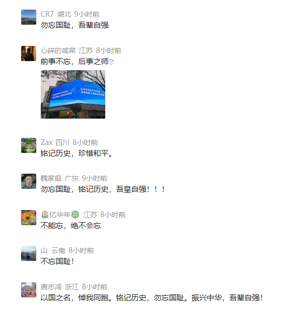 “以国之名 悼我同胞”“正视历史,不敢忘不能忘!”“永不敢忘,吾辈当自强”,留言区里,学子们的心声真挚热烈。“吾辈当以青春之力,守护和平”,武汉某高校学生在留言中写道。还有学子感慨:“书生意气不失血性,以史为鉴方能行稳致远”,字里行间满是青年担当。网民“裤裤的叫不紧张”说,不能忘不敢忘不会忘。