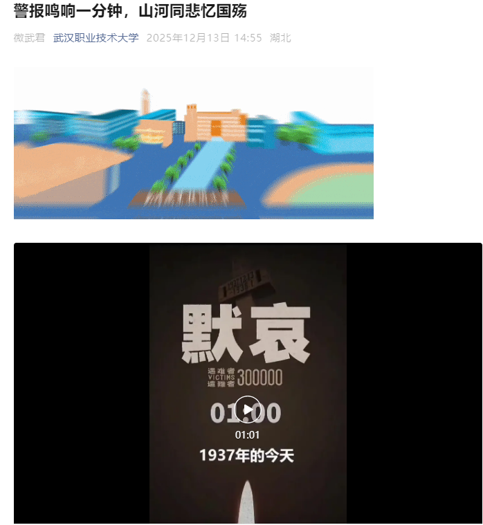 武汉职业技术大学《警报鸣响一分钟,山河同悲忆国殇》、武汉商学院“勿忘国耻”主题推送等,通过场景化描述唤醒集体记忆。湖北大学、武汉纺织大学、湖北中医药大学等高校的相关文章,均聚焦“铭记历史、珍爱和平”核心,形成传播合力。