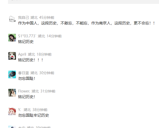 12月13日,第十二个南京大屠杀死难者国家公祭日,武汉大学、华中科技大学、华中农业大学、中南民族大学、湖北大学、武汉纺织大学、武汉轻工大学、湖北工业大学等湖北多所高校通过微信公众号发布纪念文章,缅怀遇难同胞,铭记历史,振兴中华。许多学子在留言区留言“勿忘国耻”“吾辈自强”,彰显青年一代的历史担当。