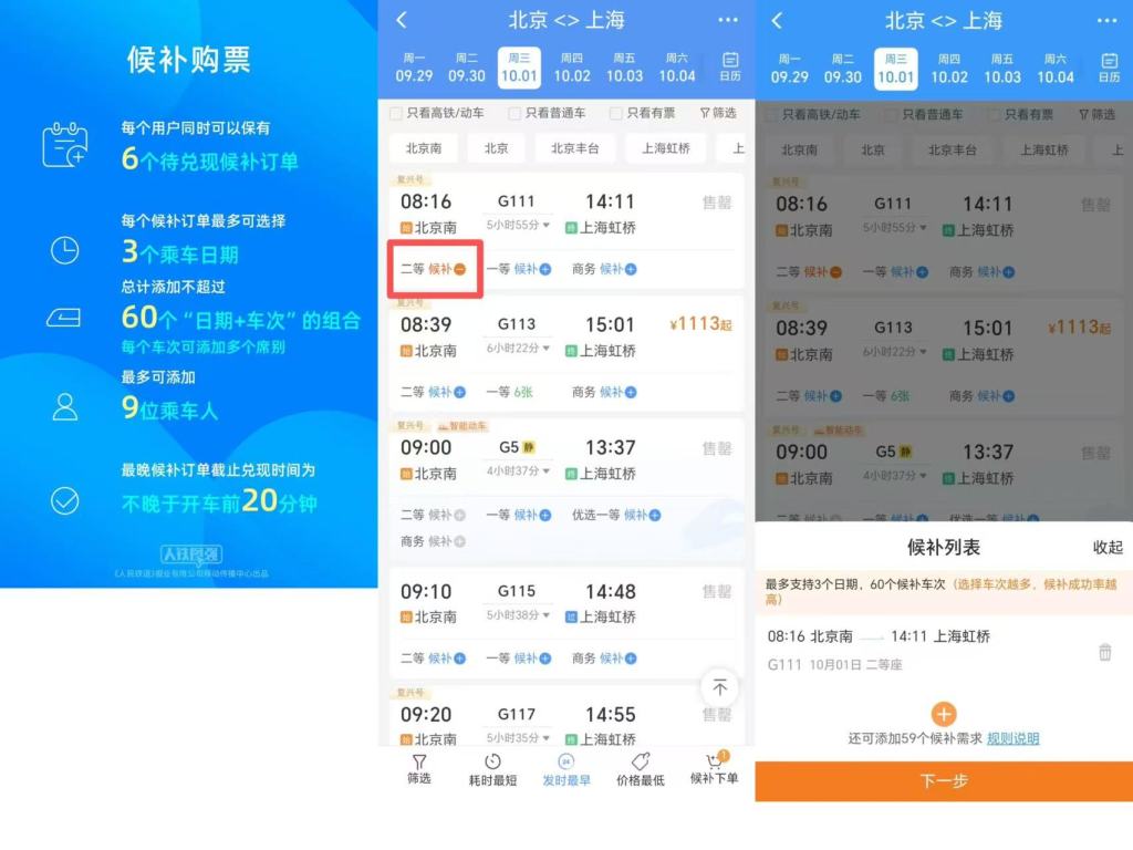 在火车票起售当日页面,点击购票信息预填,旅客即可提前选择乘车人、预选车次、预选席别,火车票起售时便可快速提交订单。第一时间未买到车票的旅客可以通过12306网站、手机客户端中的“候补购票”服务功能进行候补购票。最大限度使用60个“日期+车次”的购票组合,选择的组合越多候补成功率更高。