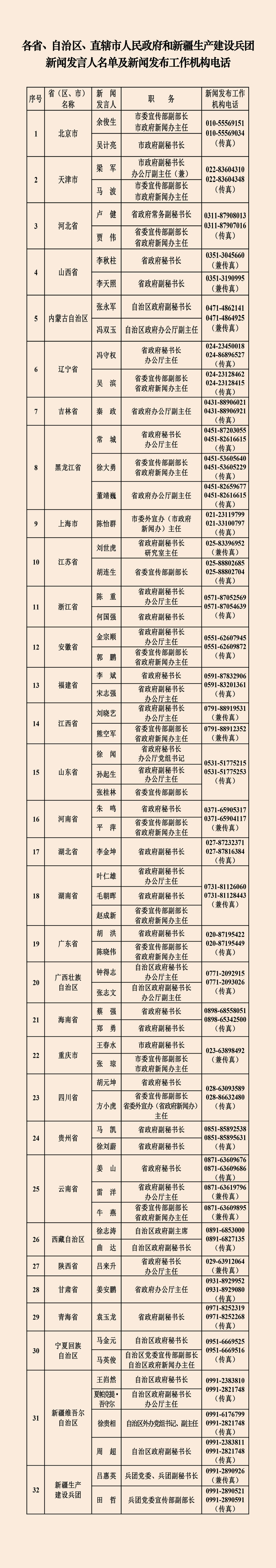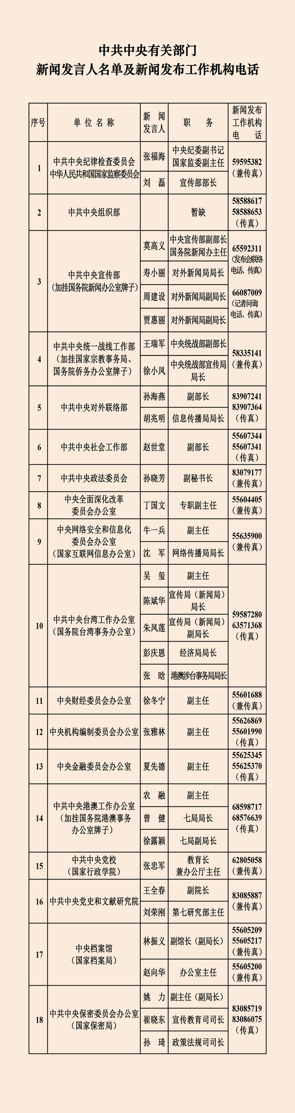 中共中央宣传部(加挂国务院新闻办公室牌子)的新闻发言人有四位,分别是中央宣传部副部长、国务院新闻办主任莫高义,对外新闻局局长寿小丽,对外新闻局副局长周建设、贾惠丽。与去年的名录相比,贾惠丽是“新面孔”。