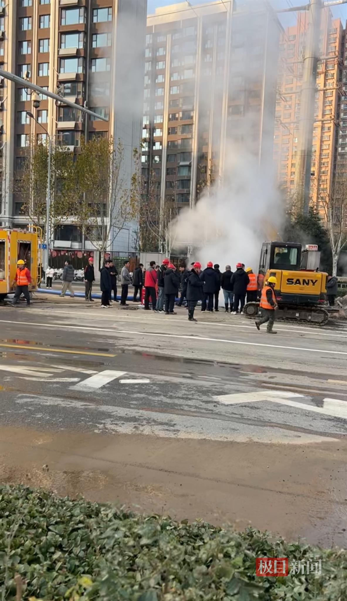 下午3时,极目新闻记者在现场看到,道路中央护栏处路面上出现一个直径数米的坑洞,从中不断升起热气,形成数米高的水雾,挖掘机正在一旁作业,坑洞旁堆起约一米高土堆。工作人员持铁锨,正在清理道路和一侧人行道上的污泥。现场已拉起警戒线,限制车辆通行,有值守人员引导车辆绕行。