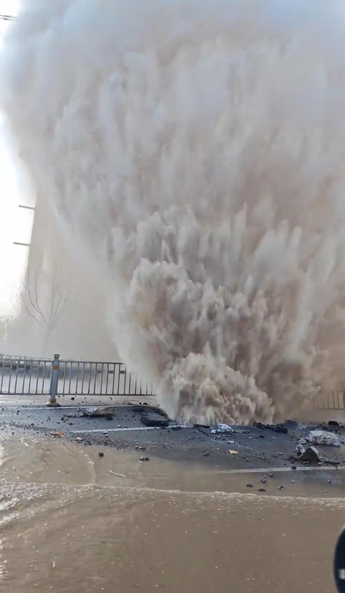 12月17日,多名济南市民在济南市奥体中路与花园东路交会处拍到疑似埋于道路下方的供暖管道爆裂,大量水流从地下喷出,形成数米高水柱。