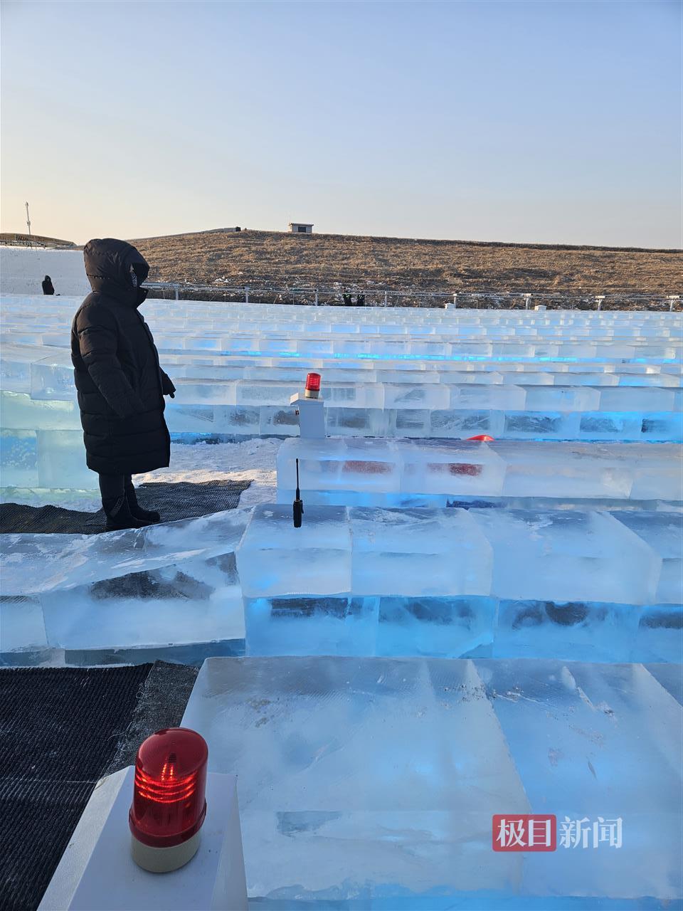 极目新闻记者在超级冰滑梯的下站口看到,一条条滑道由冰砖堆砌而成,坐在滑轮车上的游客顺着坡道滑下,每个滑道的末端均铺设了长度二十多米的防滑减速绒布。同时,每条滑道的末端均有一名工作人员,负责照看游客和收集滑轮车。工作人员每隔两个小时换一班岗,轮流值守保障场地平稳和游客安全。