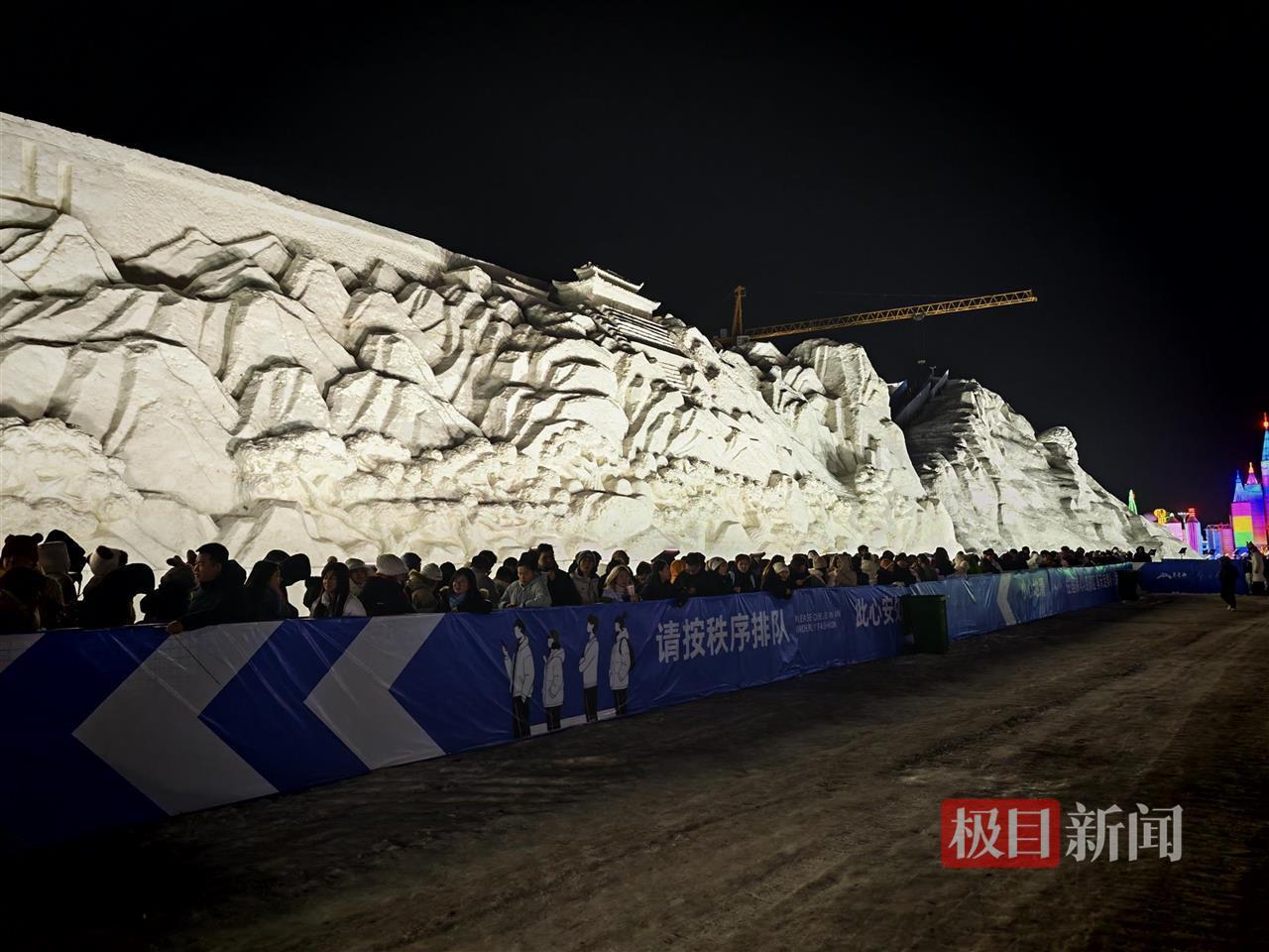 此外,园区内还有1314米珠穆朗玛雪漂流、布达拉宫大漂流、天定彩滑等娱乐项目。极目新闻记者看到,不少游客不顾东北夜晚的寒冷,在珠穆朗玛雪漂流入口前排起了一百多米的长队,现场一名工作人员称,根据目前情况估计要排队2个小时左右。