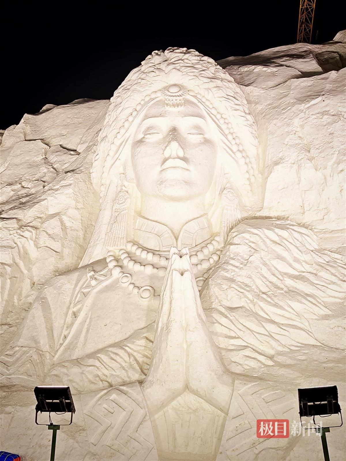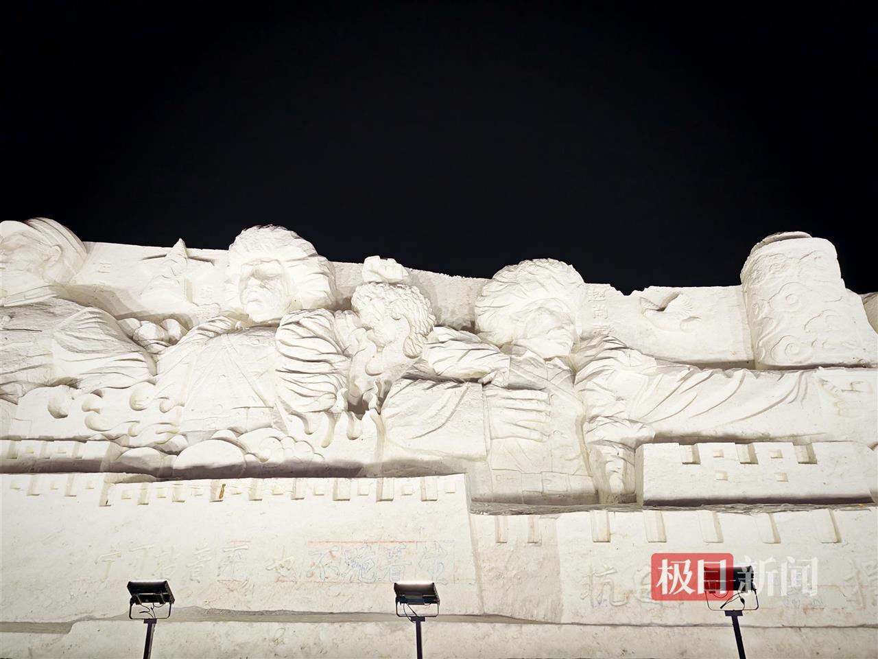 极目新闻记者发现,今年长春冰雪新天地最吸睛的莫非珠穆朗玛系列浮雕,以及戚继光、邓世昌、左权、文天祥、赵尚志、杨靖宇6名民族英雄的人物浮雕。珠穆朗玛系列浮雕一处,一名女性半身像让不少游客驻足拍照,她身着民族特色服装,双手合十,双眼微闭,显得十分庄严;另一侧6名民族英雄的浮雕下方,还刻有“宁可站着死,也不跪着生”“太行浩气传千古,留得清漳吐血花”等语句。
