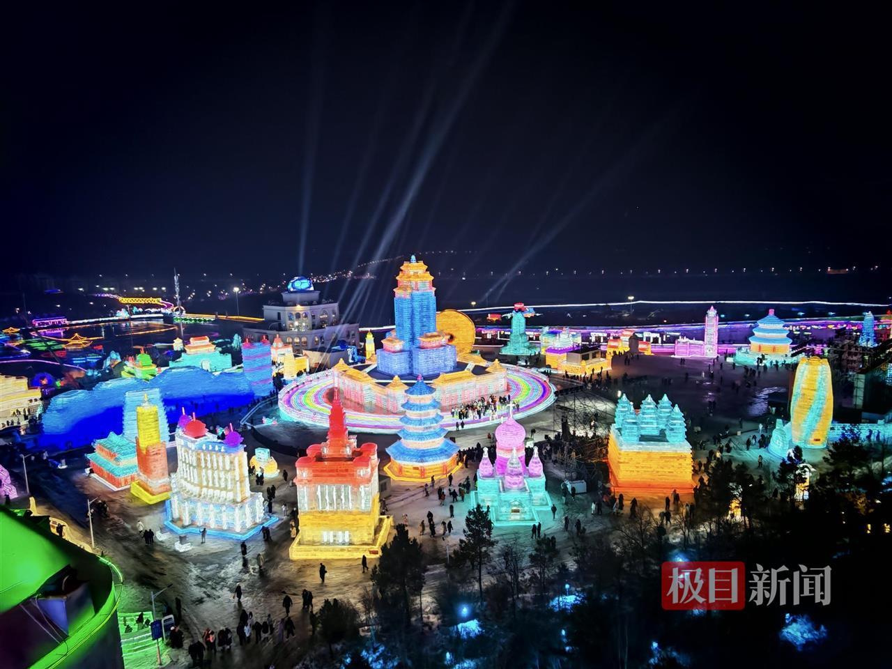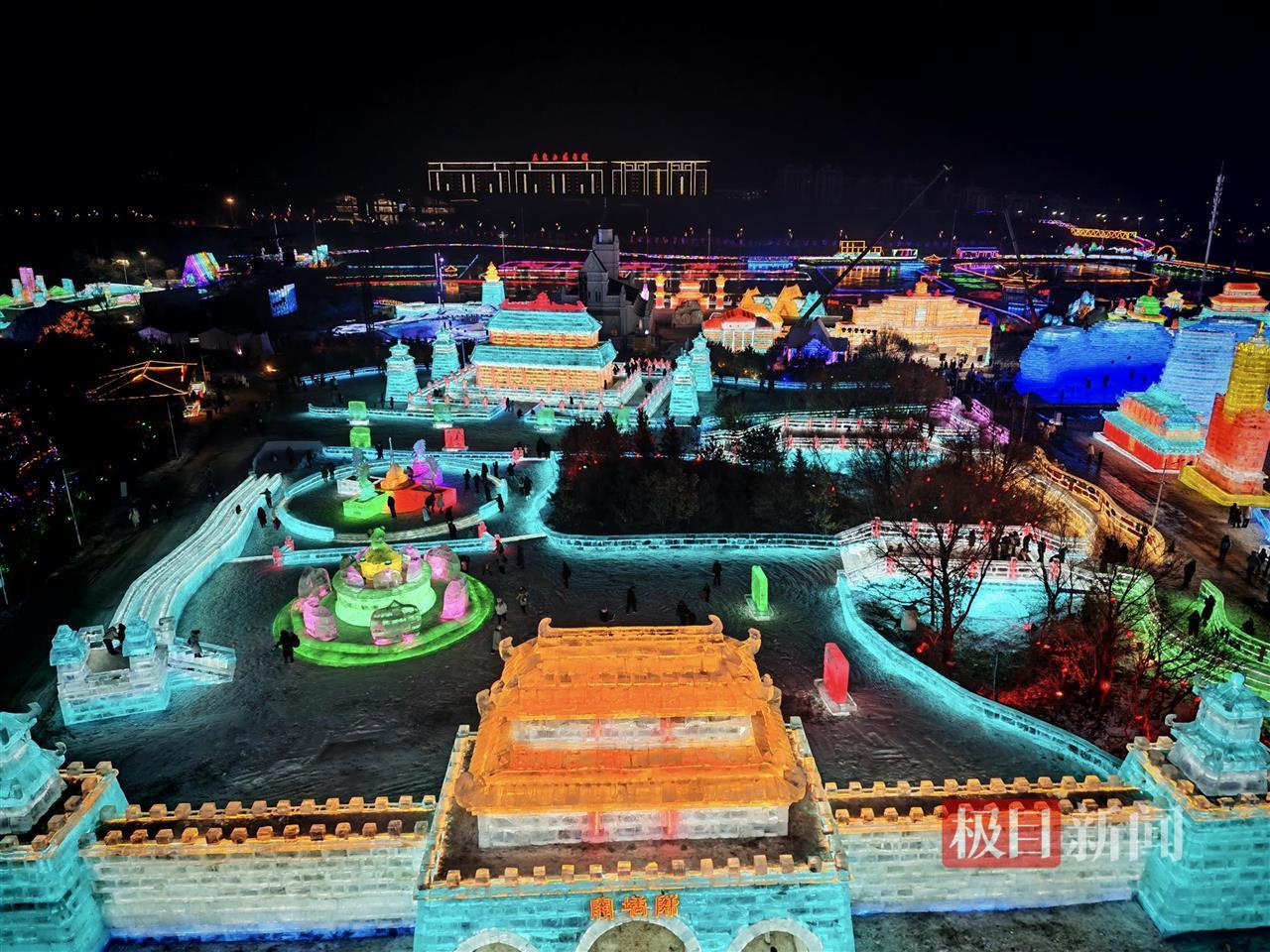 今年全新打造的长春冰雪新天地利用冰块惟妙惟肖地复刻了国内许多地标建筑,例如浙江雷峰塔、西安大雁塔、哈尔滨索菲亚大教堂、澳门银河酒店、重庆解放碑等,还有陈塘关、龙宫等特色元素,配合彩色射灯,吸引了不少游客打卡拍照。