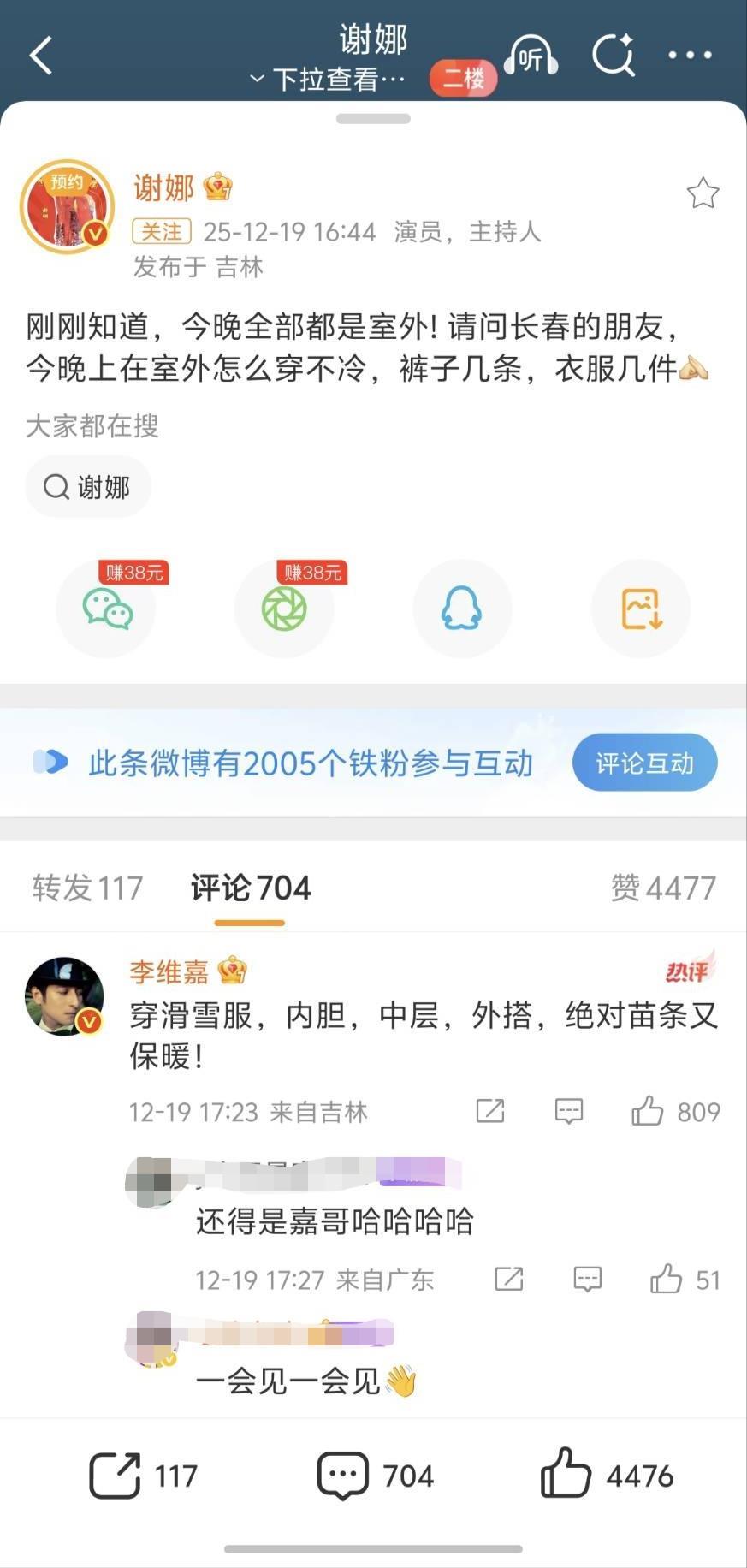 谢娜与李维嘉微博互动