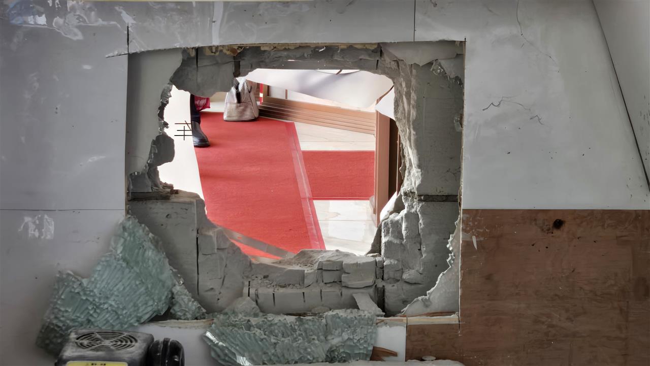 经现场细致勘查,民警发现金店配电箱遭人为破坏,店内监控因断电失效。大门右侧墙壁被砸出一个可容人通过的大洞,相邻手机维修店的门锁被撬。初步判断,嫌疑人应是先撬门进入手机店,再潜入金店实施盗窃。
