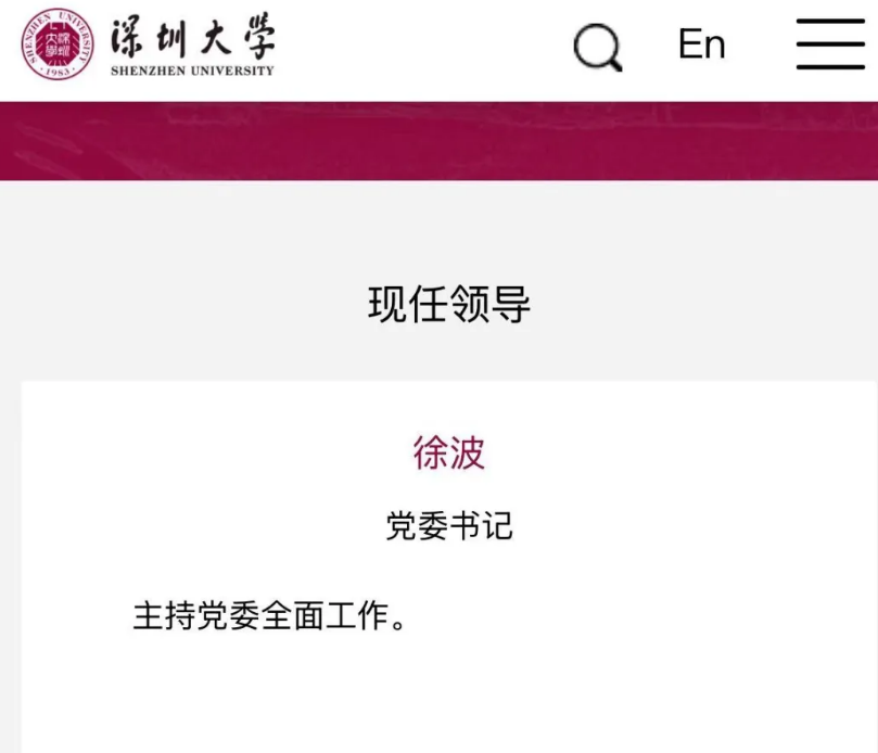 据深圳新闻网,12月23日,记者从深圳大学官网看到,“现任领导”一栏中,徐波已任深圳大学党委书记,主持党委全面工作。
