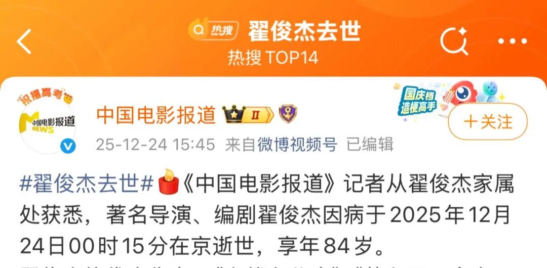 12月24日,CCTV-6《中国电影报道》独家获悉,著名导演、编剧翟俊杰于12月24日00时15分病逝,享年84岁。