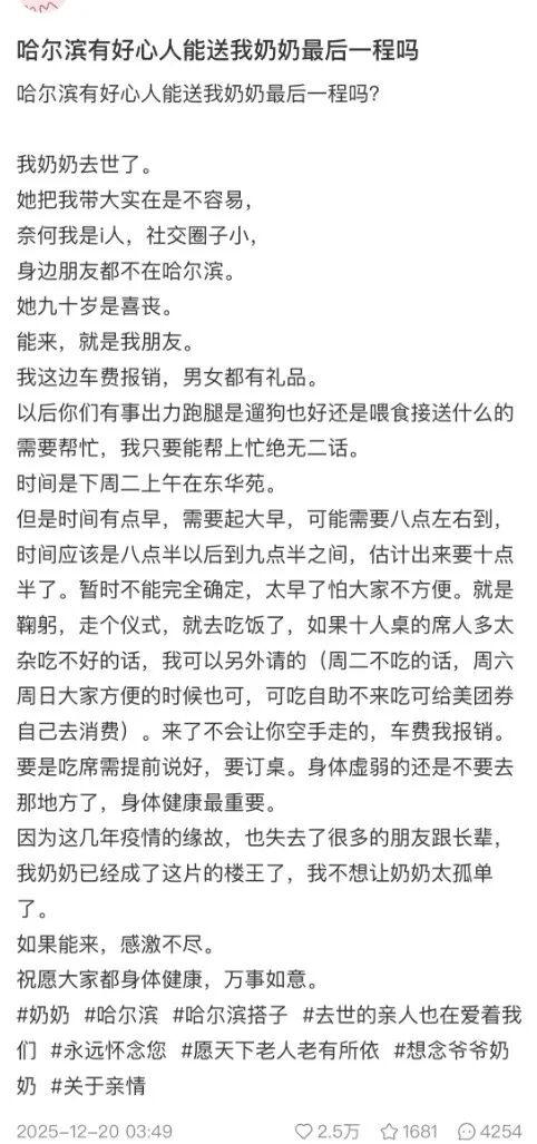 近日,社交平台上,一封《哈尔滨有好心人能送我奶奶最后一程吗?》求助信引发网友关注。相关话题词#奶奶喜丧女子因朋友少求助网友#冲上热搜。