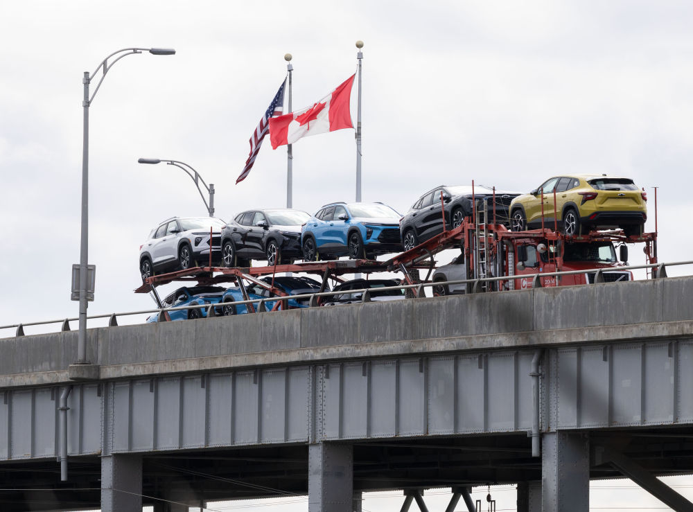 4月9日,在加拿大安大略省尼亚加拉瀑布市加美边境地带,一辆满载的汽车运输车通过刘易斯顿-昆斯顿桥开往加拿大。加拿大财政部4月8日宣布,对美国汽车对等征收25%关税措施于美国东部时间9日零时1分生效。新华社发(邹峥 摄)