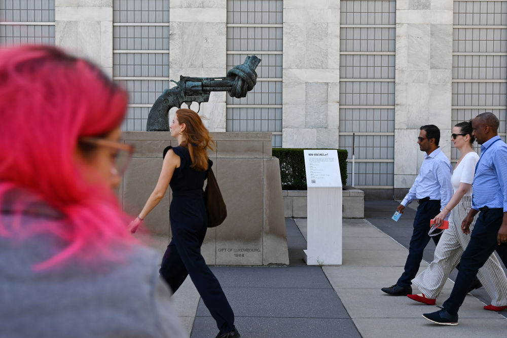 9月18日,在位于纽约的联合国总部,人们从“打结的手枪”雕塑前走过。新华社记者 李睿 摄