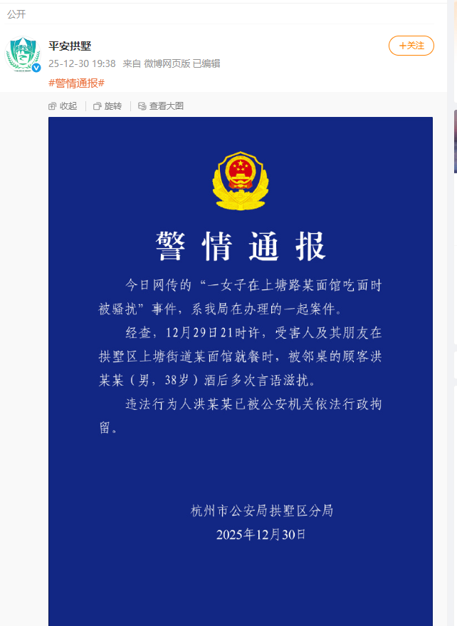 12月30日,杭州市公安局拱墅区分局发布警情通报: