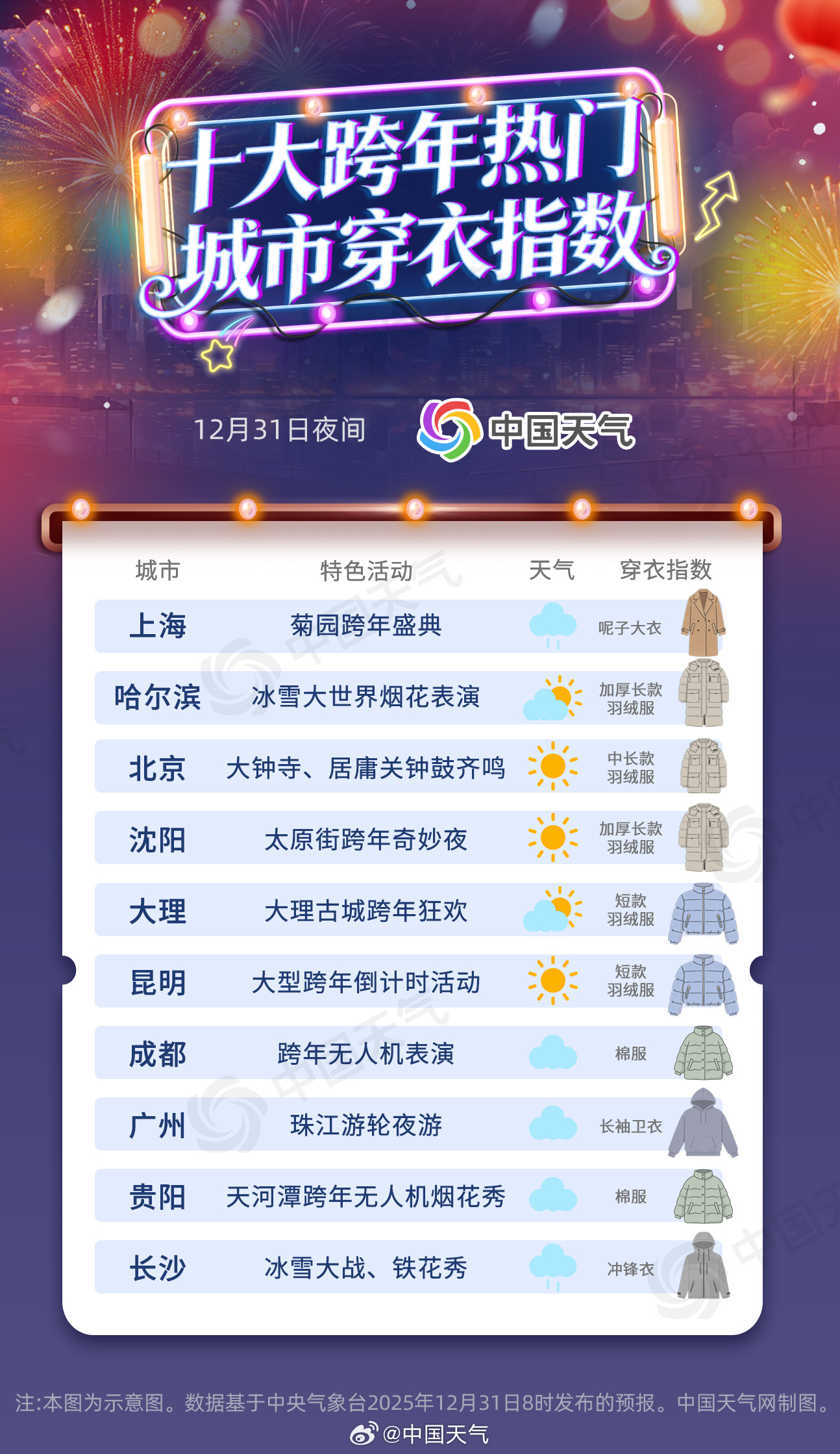 跨年夜活动丰富多彩 一图掌握十大热门城市穿衣指数
