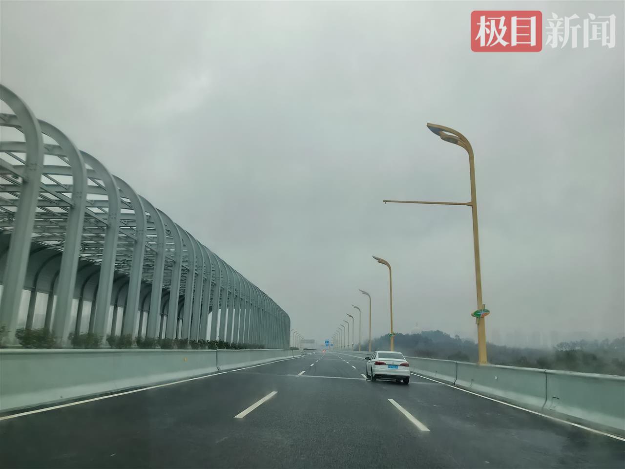 当日8时许,极目新闻记者驱车,从高架段起始点三环线武黄立交处出发,只见沿线的双向6车道路面平整,视野开阔,不少得知通车的车主也尝鲜上高架体验,在途径临近居民区的高架段路面时,高架上安装了多处声屏障设施。
